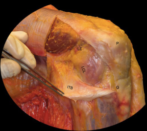 Structures of the lateral knee are more complex. These structures include the iliotibial band, biceps femoris tendon, patellofemoral ligament, patellar retinaculum, common peroneal nerve, lateral collateral ligament (LCL), fabellofibular ligament, coronary ligament, arcuate ligament, popliteofibular ligament, popliteus tendon, and lateral joint capsule (Figure 1). The primary static stabilizer of the lateral knee is the LCL and rarely constitutes an isolated injury; rather, it generally occurs in conjunction with injuries to the posterolateral corner (PLC). The PLC is comprised of the LCL, arcuate ligament, popliteofibular ligament, fabellofibular ligament, popliteus tendon, and the lateral capsule (6). Injury is commonly seen after motor vehicle accidents as well as in athletics. Injury typically is a result of a valgus force along with knee hyperextension or external tibial rotation (7). The PLC imparts important rotational stability as well.
