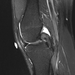 The most precise assessment of PCL injury is the posterior drawer test where, at 90 degrees of flexion, a posteriorly directed force is applied on the proximal tibia. In an uninjured knee, normally a step off anteriorly of 1 cm from the medial femoral condyle to the tibial plateau exists. The grading system mimics that of the ACL where grade I corresponds to translation of 1 to 5 mm while the normal step off remains. A grade II injury has 5 to 10 mm of translation and the condyle and plateau are flush, while grade III exhibits >10 mm of translation with the plateau being posterior to the condyle. This indicates a complete PCL tear. The posterior sag test, also known as Godfrey’s Test, evaluates this step off which is created by the tibial weight shifting the plateau posteriorly. The quadriceps activation test also is useful for evaluating PCL injury and is done with the knee at 60 degrees. During quadriceps activation, if a grade III tear exists, the tibia reduces anteriorly. The dial test is also essential to assess concomitant PLC injury, as the treatment and outcome will be different. Beyond concomitant ligamentous injury, evaluation of the menisci is essential. Careful and complete MRI review is important (Figure 7).