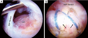 Partial-thickness rotator cuff tears (PTRCTs) are most commonly classified by the RC tendons involved, tear location, and by the thickness of the tear. In the Ellman classification system (17) the tear is first identified by location: A. articular-surface, B. bursal-surface, or C. interstitial. The tear is then graded according to its depth: (I) <3 mm (<25% thickness); (II) 3–6 mm (25–50% thickness); and (III) >6 mm (>50% thickness). This grading system assumes the RC footprint to be approximately 10–12 mm in the medial to lateral dimension. However, this classification system does not take into account several factors such as the length of the tear (anterior to posterior size of tear along the tendon footprint), tissue quality of the tendon, or the etiology of the tear (traumatic or degenerative). Compounding upon these limitations, the MOON group has demonstrated poor interobserver reliability in predicting the tear grade on MRI, and only moderate interobserver reliability in predicting the location of the tear (articular or bursal-sided) (18). Regardless of these shortcomings, the Ellman classification system continues to be the most universally utilized system for PTRCTs. Treatment recommendations are based upon the understanding of the histopathology of the tendon, and the depth of the tear. As the depth of the tear increases, there is increased strain on the remaining tendon (19), which may propagate development of a full-thickness tear. Also, the articular side of the tendon has only half of the strength of the bursal side, and accordingly, bursal sided tears are treated more aggressively. Articular sided tears over 6 mm are recommended to be repaired (20), while the threshold to repair bursal sided tears is >3 mm (21).