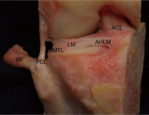 Anterior to the popliteal hiatus you can see small ligamentous structures in disarray that aid in fixing the meniscal body, thereby preventing its displacement during movement and its extrusion on weightbearing. This is a “dark area” where the literature is confusing, not detailed and is described from distinct and fragmented points of view. Historically, some studies started to define this set of structures as the menisco-fibular ligament (MFL), which was described for the first time in humans by Zivanovic et al. (35). Another structure, the meniscus-tibial ligament (MTL) or coronary ligament, has been described later to refer to the same area and further confuse the issue (36). However, Masferrer-Pino et al. recently published an anatomical study aiming to redefine, analyze and quantify the anatomy of the peripheral attachments of the body of the lateral meniscus (15).