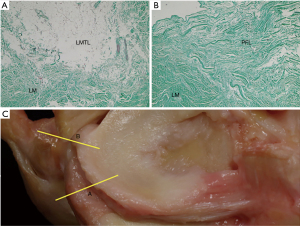 - Zemirline A, Gerard R, Uguen A, et al. Meniscoligamentous band between the posterior horn of the lateral meniscus and the anterior cruciate ligament: arthroscopic, anatomical and histological observations. Surg Radiol Anat 2010;32:129-33. [Crossref] [PubMed]