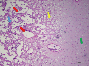 Histologically, the meniscal structure corresponds to that of a fibrocartilage composed of cells and a proteoglycan matrix in which fibers are embedded (Figure 1). Several types of cells can be identified: fibrochondrocytes, fibroblasts and mast cells. The dominant cellular element is the fibrochondrocyte. It is mainly present in the innermost part of the meniscus (white-white zone). Fibroblasts are quite common in the fibro-fatty region where the meniscus blends with the joint capsule (red-red zone) (2).