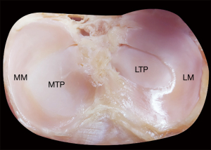 The Latin word meniscus comes from the Greek word “meniskos”, meaning “crescent,” diminutive of “mene”, meaning “moon” (10). Nevertheless, the lateral meniscus is more a circular-shaped wedge of fibrocartilage with a roughly triangular shape in a cross-section view. It is more uniform in width, smaller and considerably more mobile than the medial meniscus. It also occupies a greater portion of the articular tibial surface (~80% vs. ~60%) (10,11) (Figure 2). The mean peripheral lengths of the menisci in Caucasic specimens is 111.15 mm with a huge variation in range depending on the gender and anthropometric parameters (from 79 to 131 mm). The mean width of the body and the posterior horn is 10.5 mm whereas it is 7.5 mm for the anterior horn (12,13).