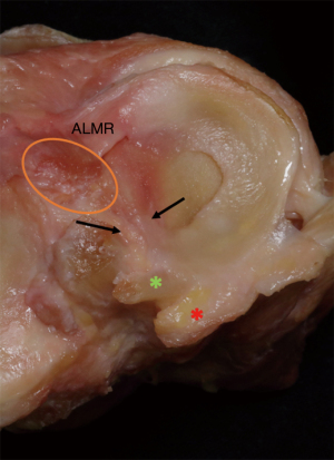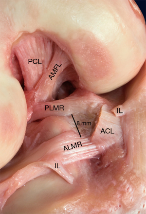 The center of the ALMR was found to be anteromedial (~14.5 mm) to the apex of the lateral tibial eminence, anteromedial (~7 mm) to the closest edge of the articular cartilage of the lateral tibial plateau, anterolateral (~5 mm) to the center of the ACL tibial attachment and anterior to the nearest edge of the posterior lateral meniscal root (23-25).
