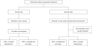 Current evidence suggests a fairly simple algorithm for the management of partial rotator cuff tears (Figure 1): Symptomatic, high-grade partial-thickness (greater than 50%) rotator cuff tears for which nonoperative treatment has failed continue to be best managed by repair, either arthroscopic or mini-open repair, with good results. Although it has been challenging to determine whether acromioplasty improves the results of full-thickness tear repair, bursal-side tears seem to show better outcomes with concomitant acromioplasty (10,20).